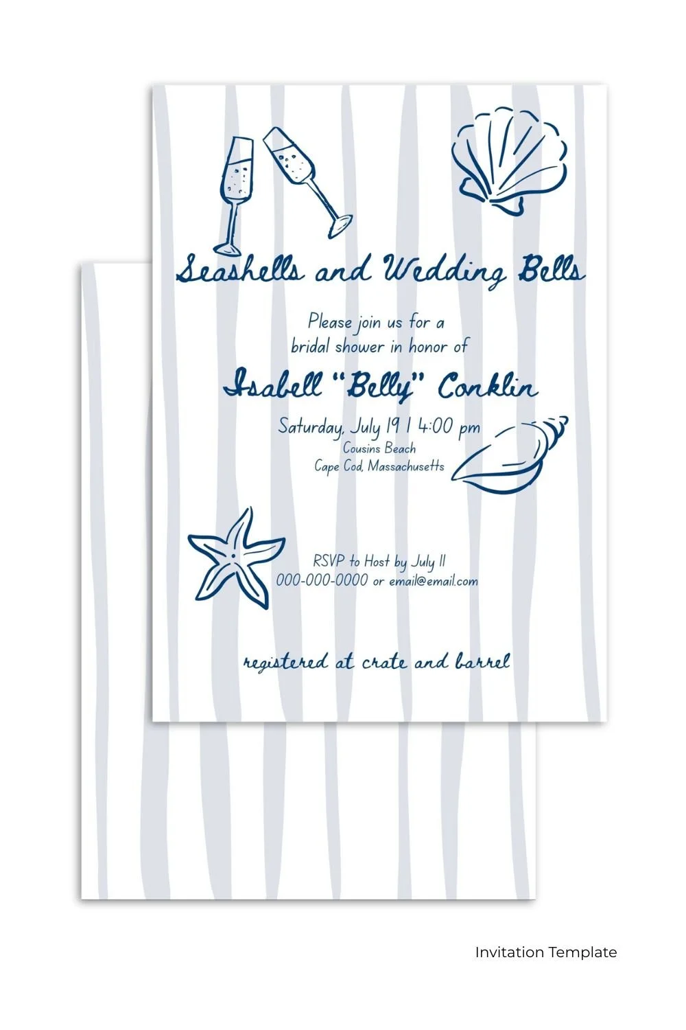 Celebrate the bride-to-be with this breezy and elegant Seashells and Wedding Bells bridal shower invitation. Perfect for ocean-inspired celebrations, this editable Canva template allows you to create a personalized design quickly and easily, even without design experience.